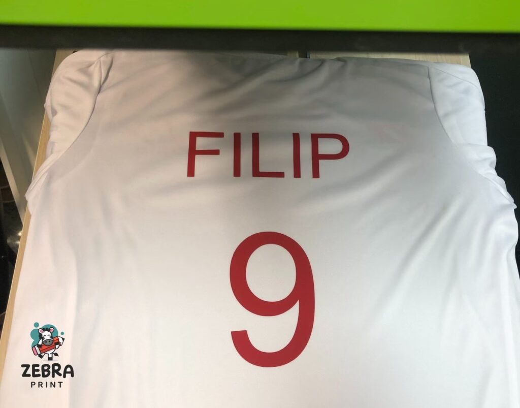 - Nadruk sublimacyjny: Jest to absolutnie nieusuwalny nadruk. Rozpoznanie go jest stosunkowo proste: występuje wyłącznie na sztucznych materiałach, takich jak poliester i jego pochodne, oraz jest całkowicie niewyczuwalny w dotyku. To nie jest tradycyjny nadruk, lecz proces chemiczny, w którym barwnik wnika w strukturę włókien, zmieniając ich kolor na stałe. Mimo że nazywamy to nadrukiem, bliżej temu procesowi do barwienia materiału. Próby usunięcia go są bezcelowe i mogą jedynie doprowadzić do zniszczenia odzieży.