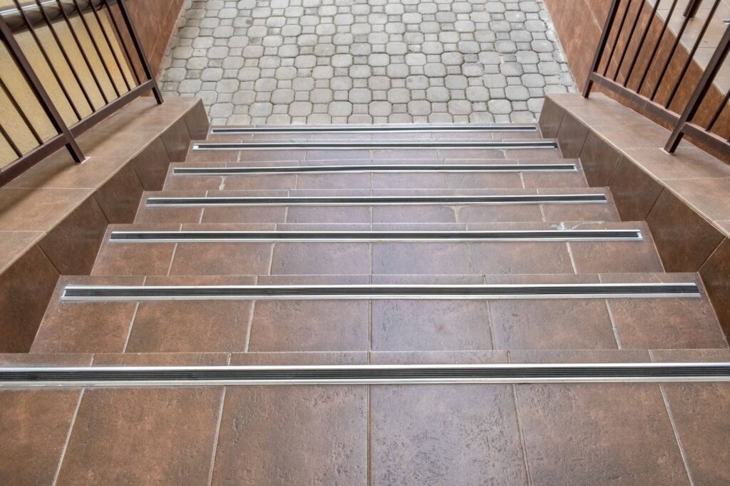 Projekt i konserwacja schodów mogą znacząco zmniejszyć lub zwiększyć potencjał wypadków. Rodzaj płytek wybranych na stopnie jest zatem kluczowy i musi uwzględniać środowisko, w którym schody będą funkcjonować. Federalne, stanowe i lokalne przepisy budowlane regulują projekt schodów, aby chronić użytkowników. Warto zaznaczyć, że w USA, ustawa o niepełnosprawnych (ADA) określa dodatkowe wymagania, takie jak kolorowe oznaczenia stopni, oznaczenia bieżników schodów zewnętrznych, antypoślizgowe bieżniki, maksymalna odległość noska oraz zakaz otwartych podstopnic. Wszystkie te wymogi mają na celu zapewnienie maksymalnego bezpieczeństwa.