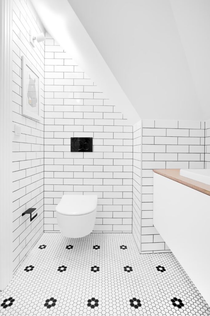 - Jasne płytki rozjaśniają pomieszczenie.
