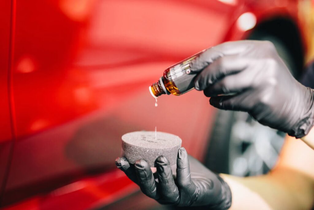 - Aplikacja: Nałóż kilka kropel powłoki ceramicznej na aplikator (zazwyczaj dołączony do zestawu lub zakupiony osobno). Następnie równomiernie rozprowadź produkt na wybranym fragmencie lakieru.